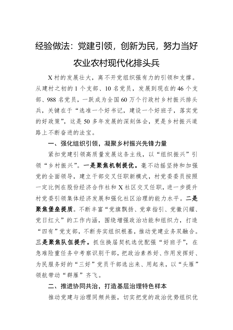 / 经验做法:党建引领,创新为民,努力当好农业农村现代化排头兵