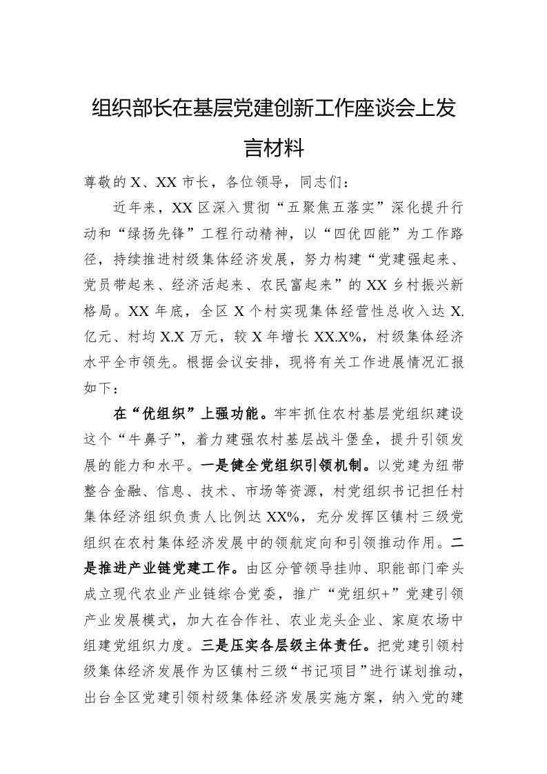/ 组织部长在基层党建创新工作座谈会上发言材料