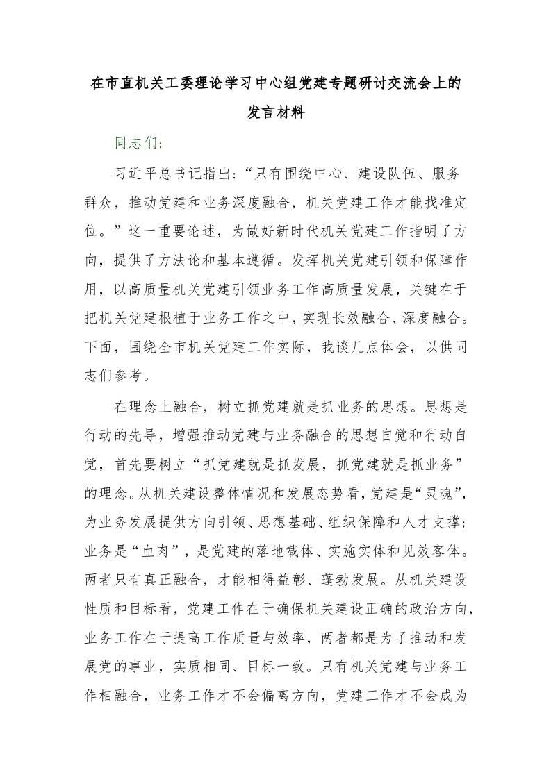 / 在市直机关工委理论学习中心组党建专题研讨交流会上的发言材料 (2)