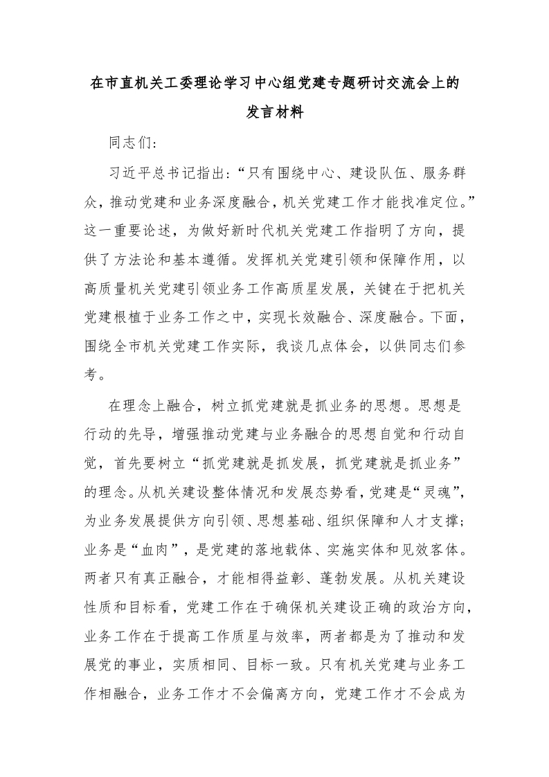 / 在市直机关工委理论学习中心组党建专题研讨交流会上的发言材料
