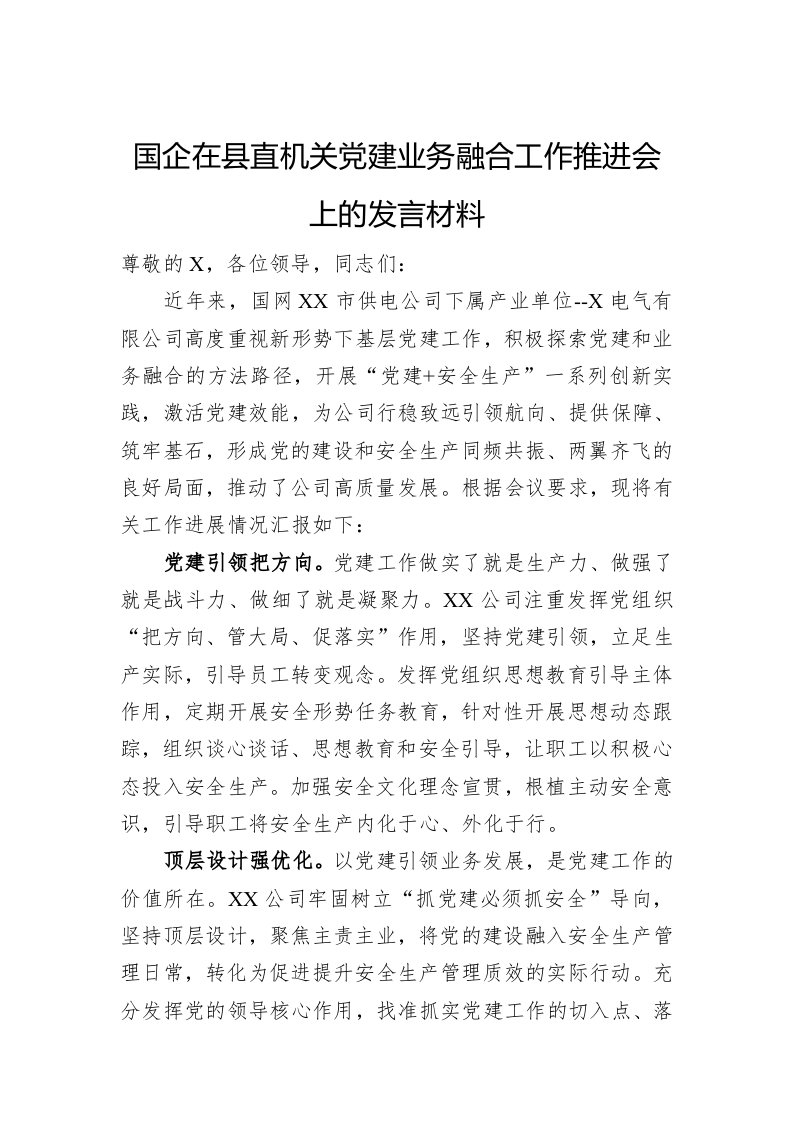 / 国企在县直机关党建业务融合工作推进会上的发言材料