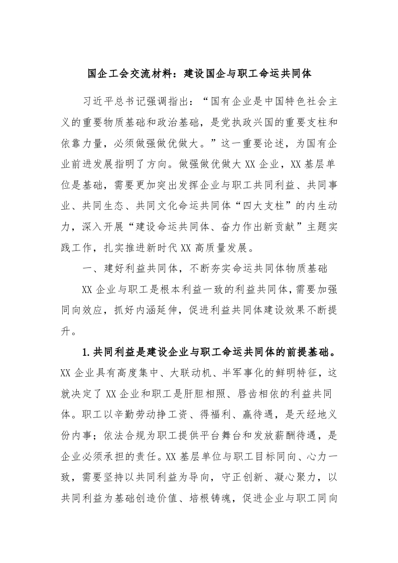 / 国企工会交流材料:建设国企与职工命运共同体