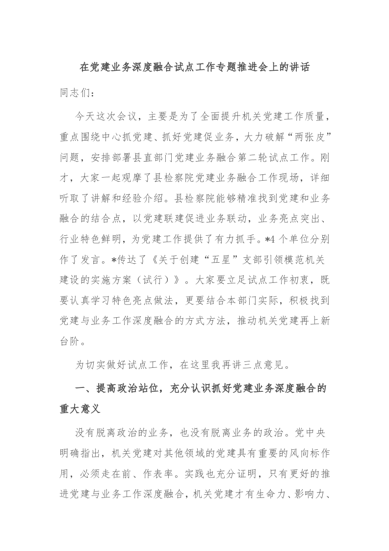 / 在党建业务深度融合试点工作专题推进会上的讲话