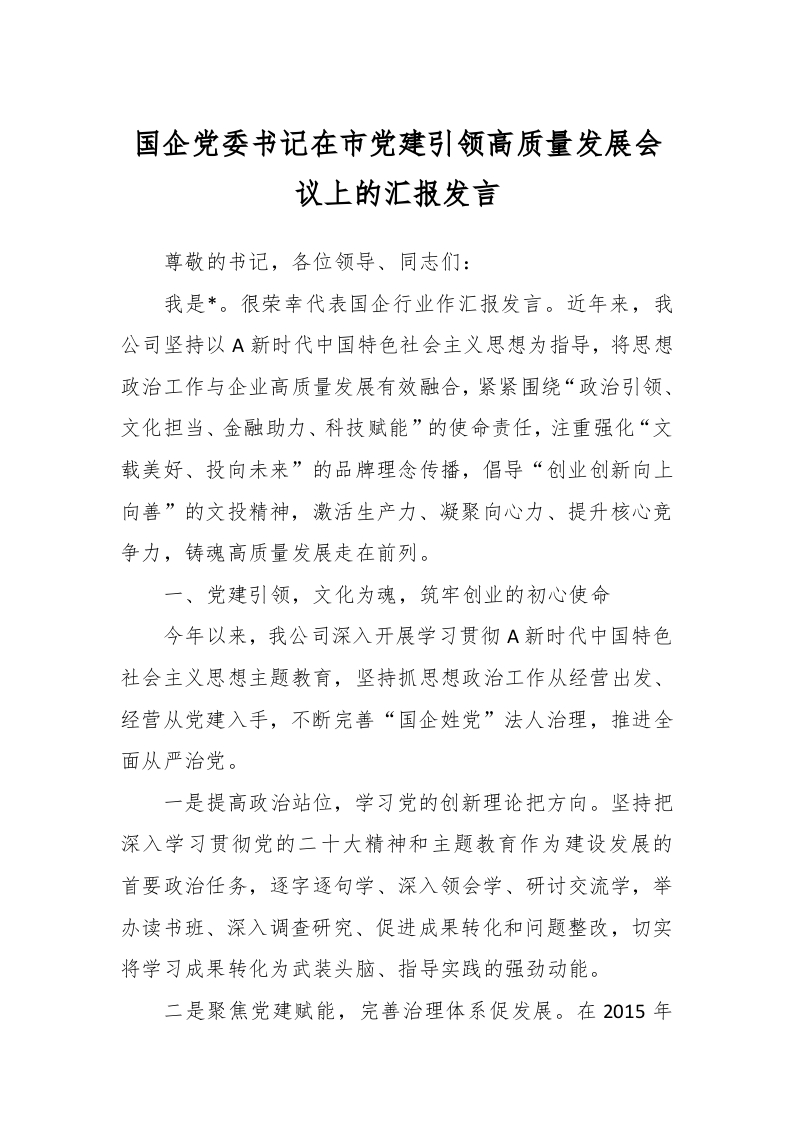 / 国企党委书记在市党建引领高质量发展会议上的汇报发言