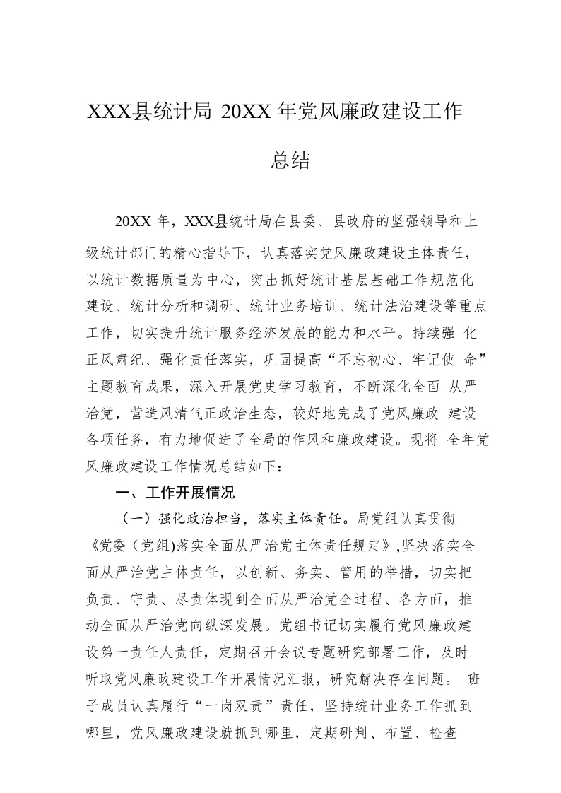 / XX县统计局20XX年党风廉政建设工作总结(20220530)