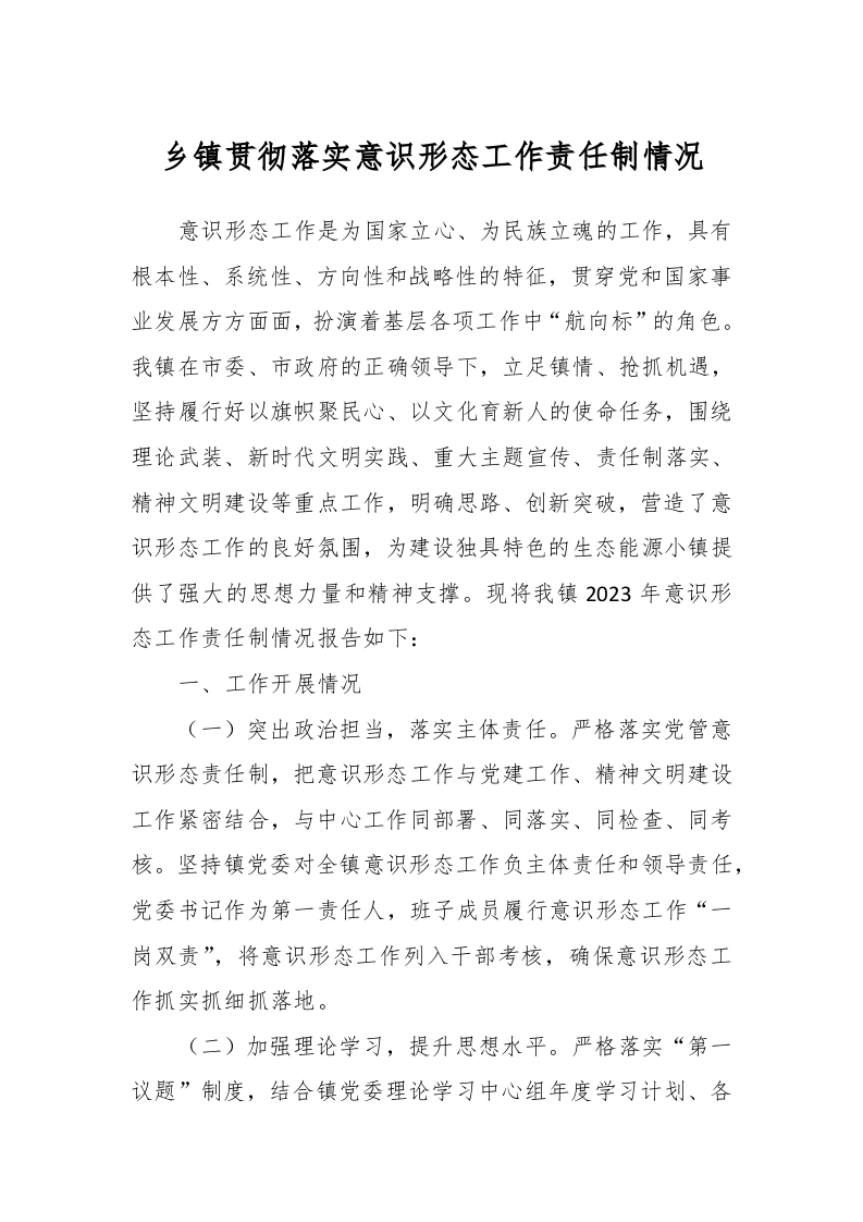 乡镇贯彻落实意识形态工作责任制情况