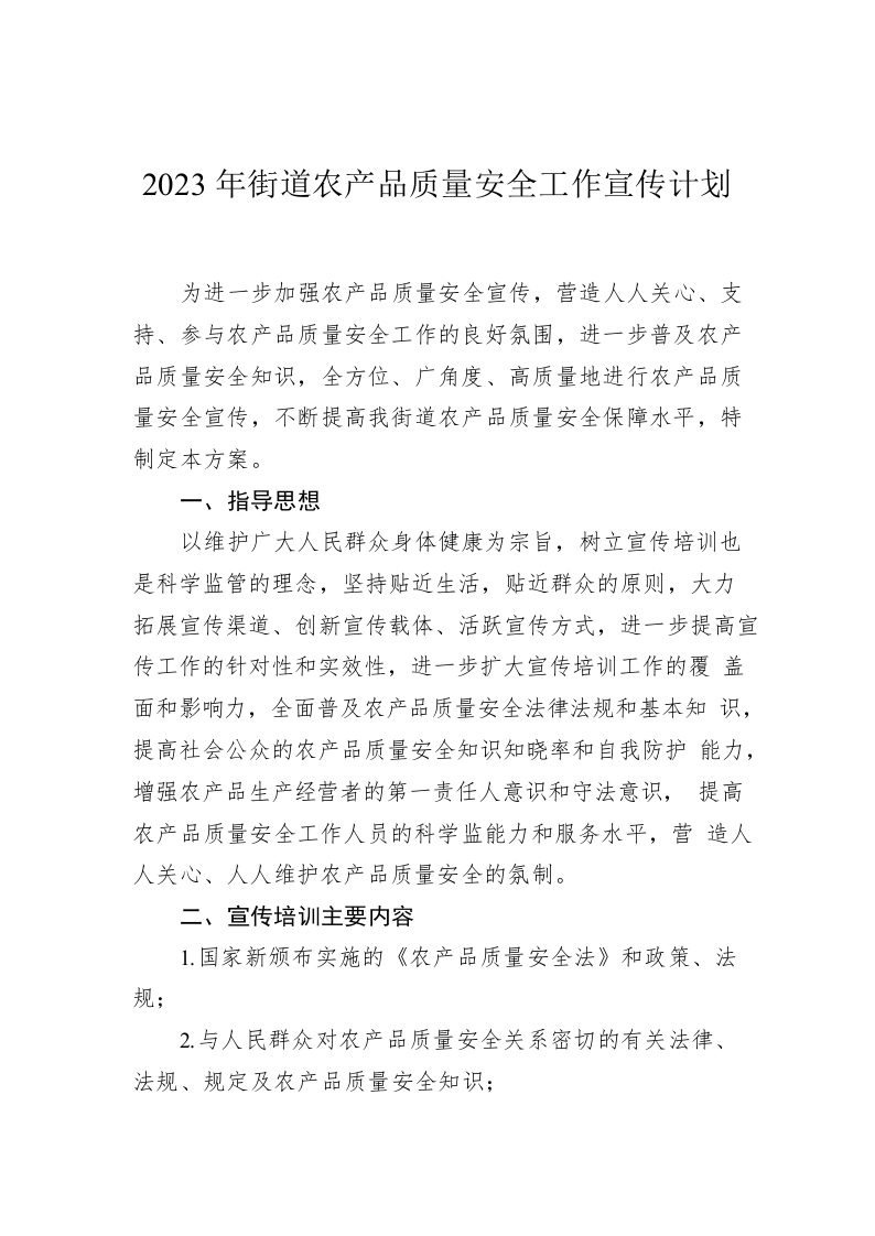 / 2023年街道农产品质量安全工作宣传计划
