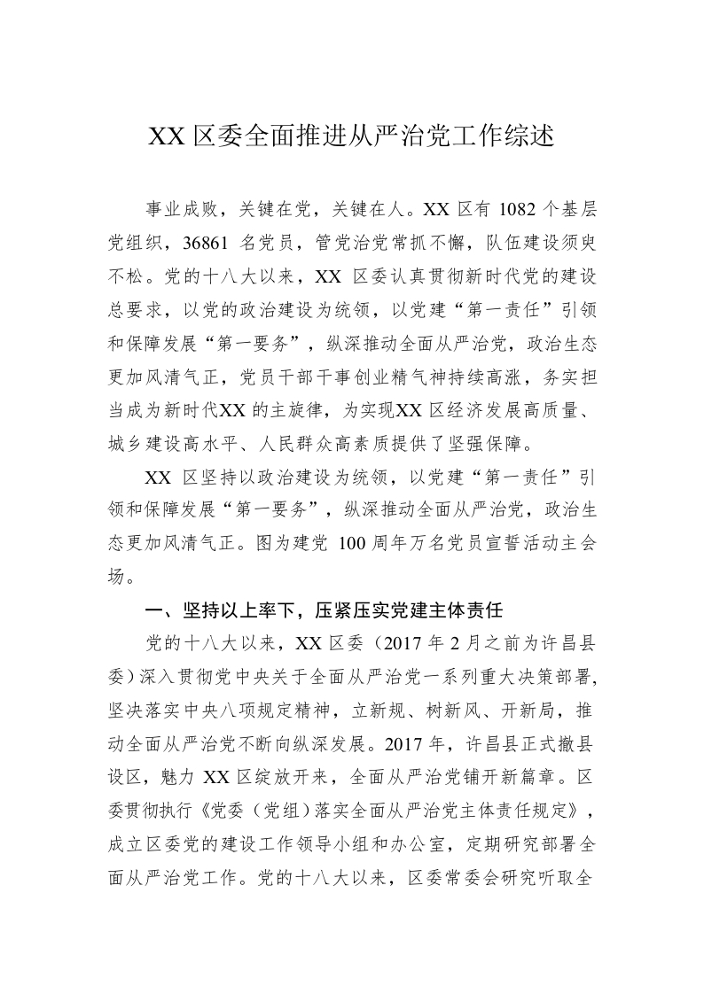 / XX区委全面推进从严治党工作综述(20221010)