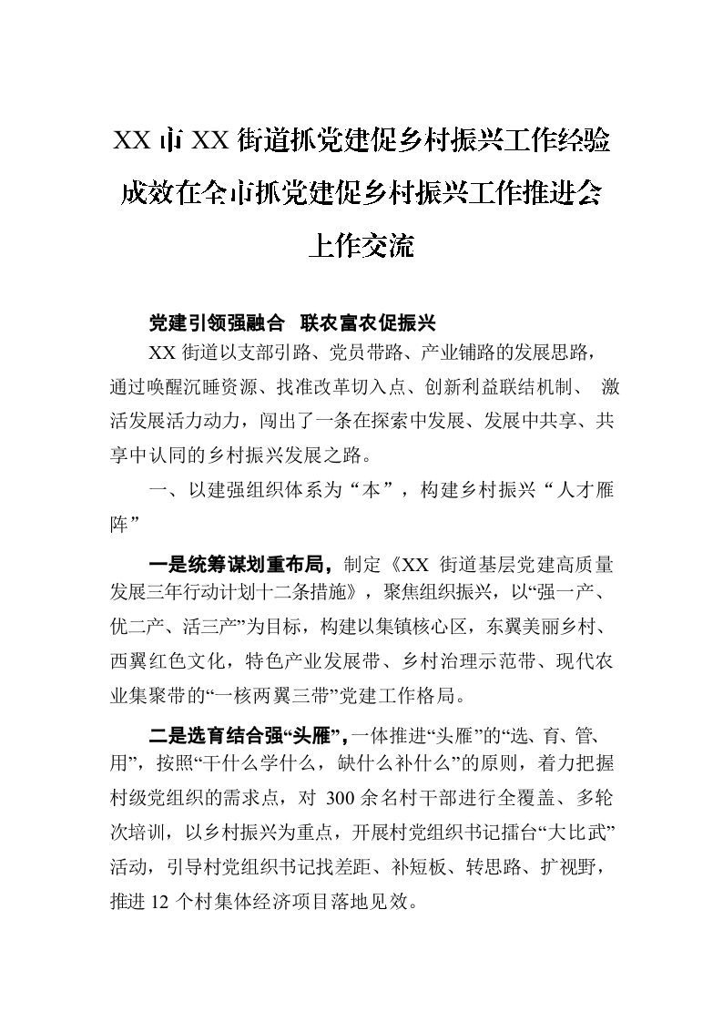 / XX市XX街道抓党建促乡村振兴工作经验成效在全市抓党建促乡村振兴工作推进会上作交流