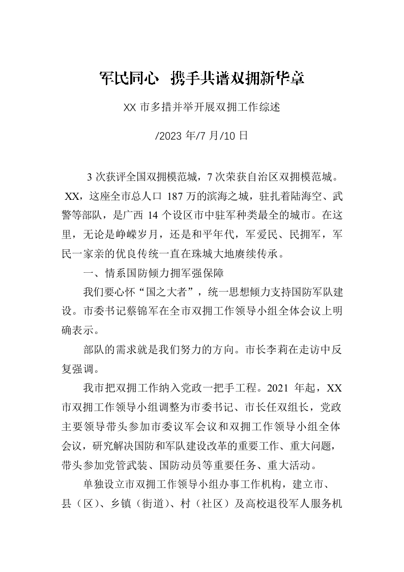 / XX市多措并举开展双拥工作综述