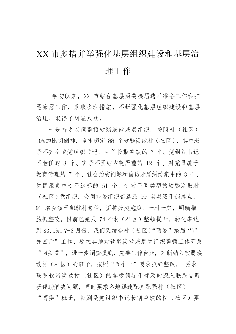 / XX市多措并举强化基层组织建设和基层治理工作