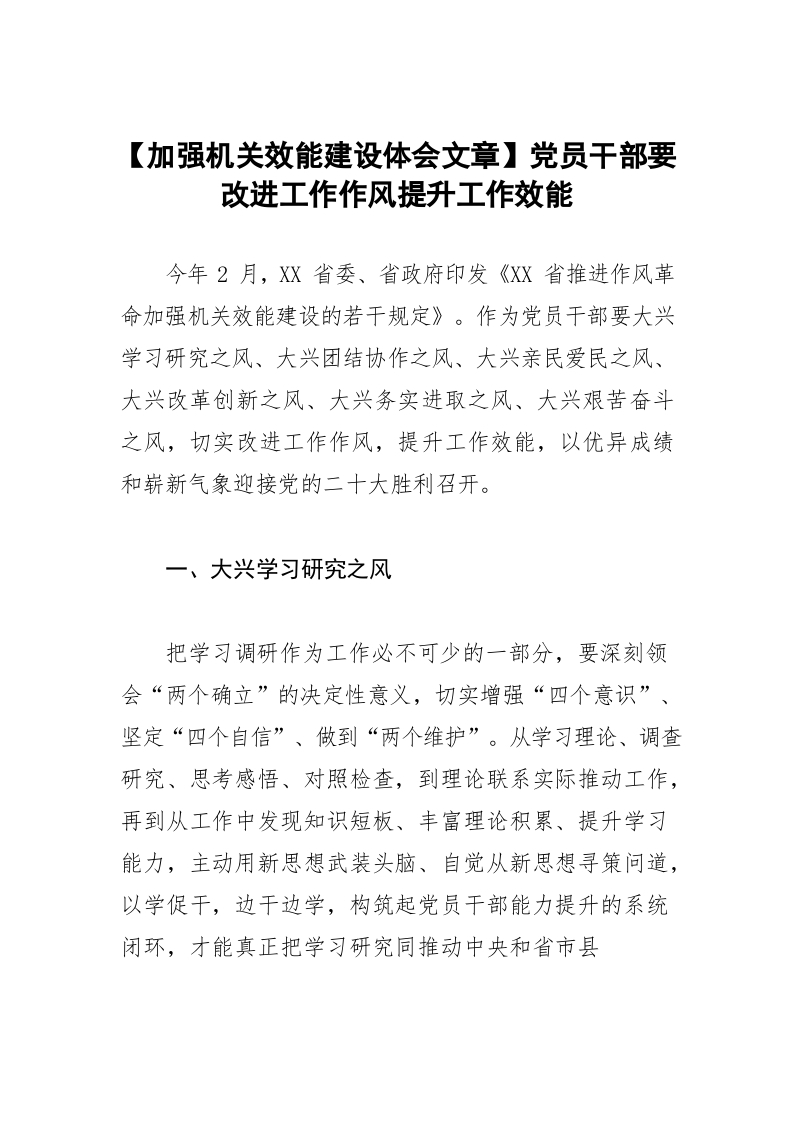 【加强机关效能建设体会文章】党员干部要改进工作作风提升工作效能