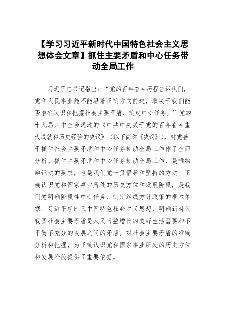 / 【学习习近平新时代中国特色社会主义思想体会文章】抓住主要矛盾和中心任务带动全局工作