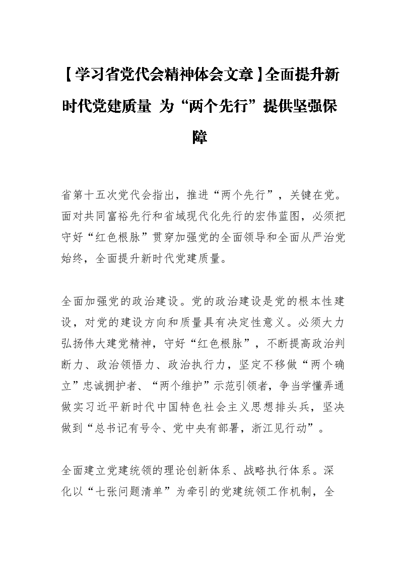 / 【学习省党代会精神体会文章】全面提升新时代党建质量 为“两个先行”提供坚强保障