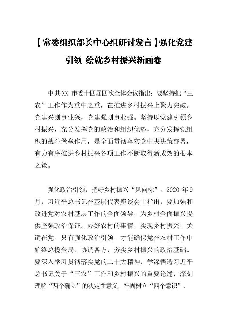 / 【常委组织部长中心组研讨发言】强化党建引领 绘就乡村振兴新画卷