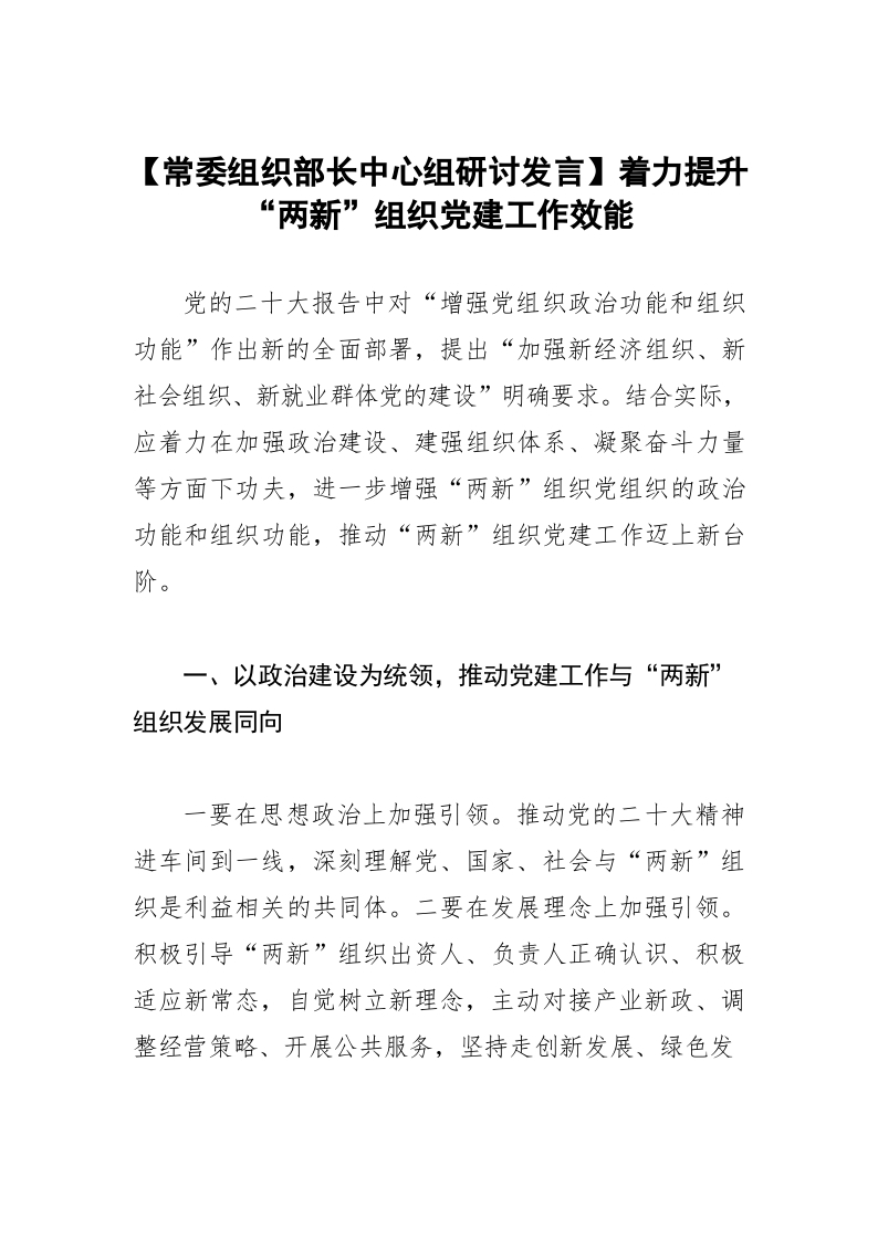 / 【常委组织部长中心组研讨发言】着力提升“两新”组织党建工作效能