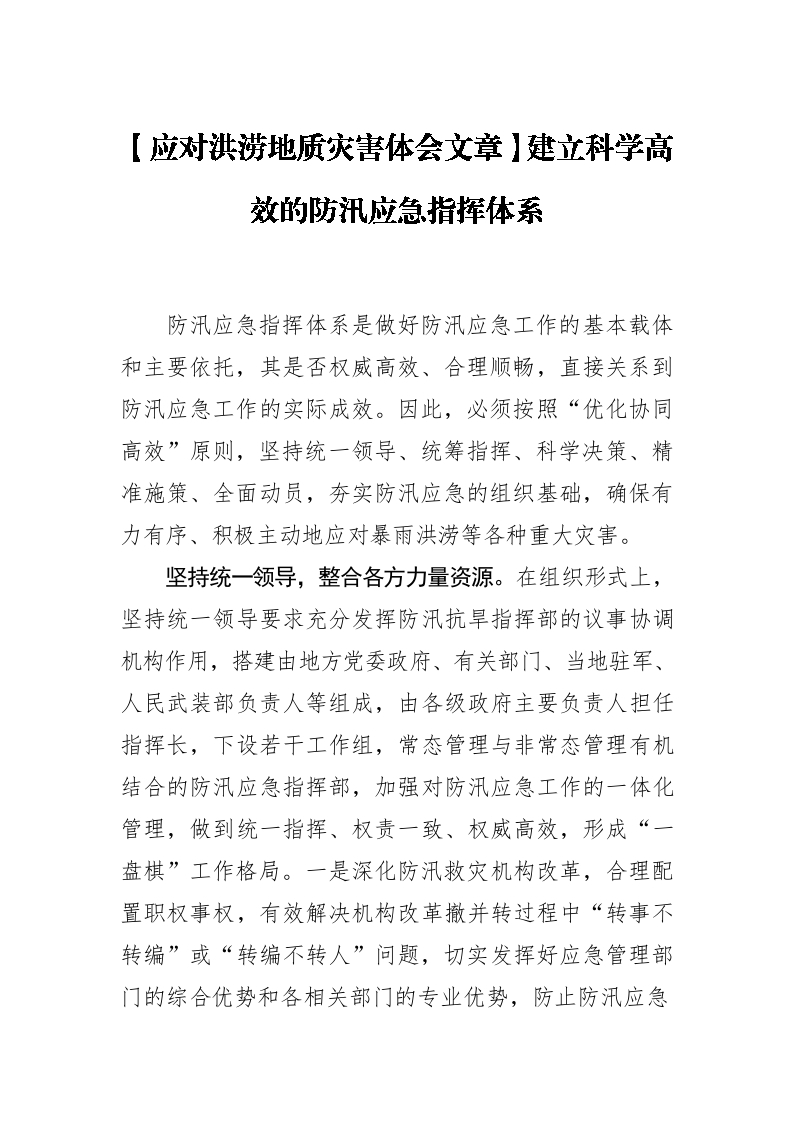 / 【应对洪涝地质灾害体会文章】建立科学高效的防汛应急指挥体系