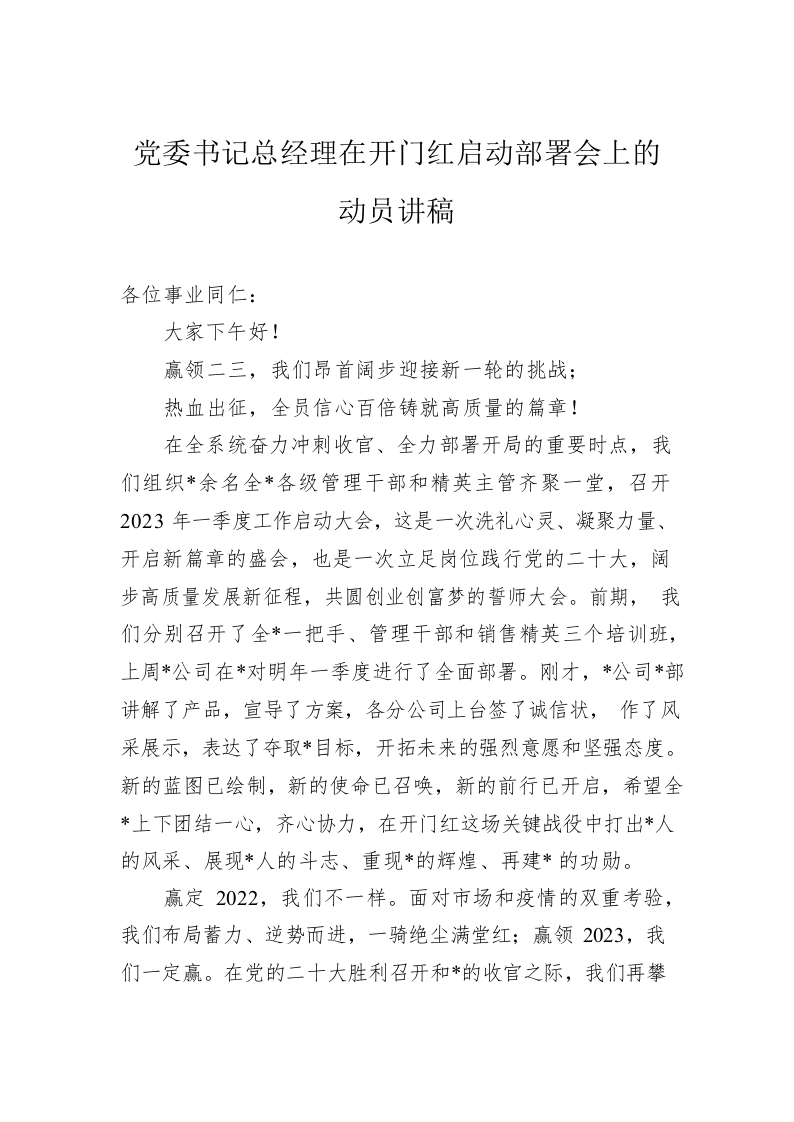 党委书记总经理在开门红启动部署会上的动员讲稿