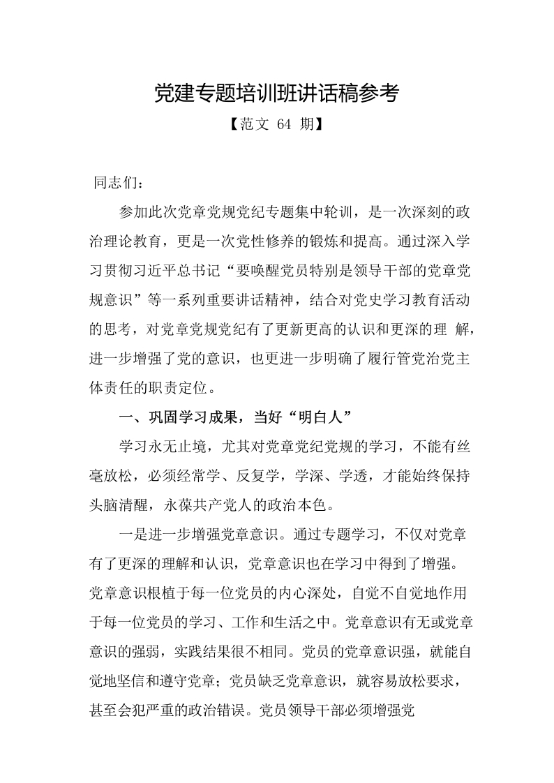 / 党建专题培训班讲话稿参考