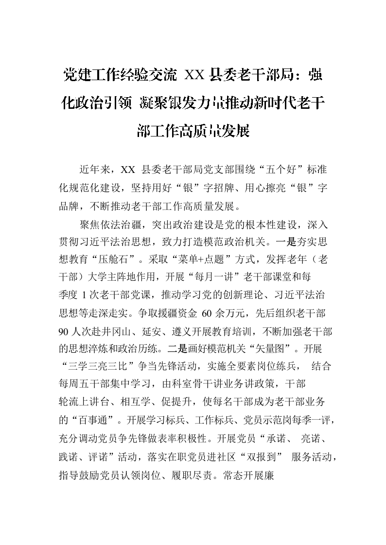/ 党建工作经验交流 XX县委老干部局:强化政治引领 凝聚银发力量推动新时代老干部工作高质量发展