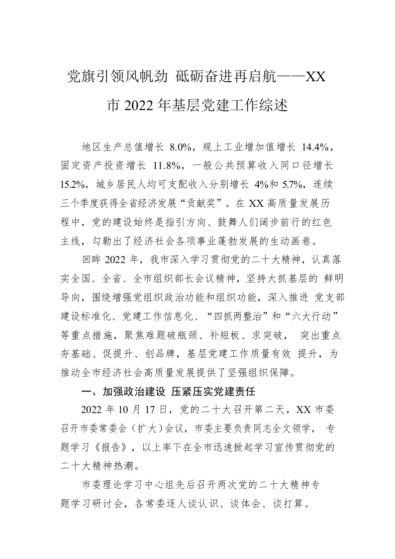 / 党旗引领风帆劲 砥砺奋进再启航——XX市2022年基层党建工作综述(20230112)