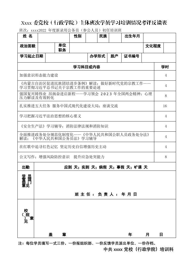 / 党校(行政学院)主体班次学员学习培训情况考评反馈表
