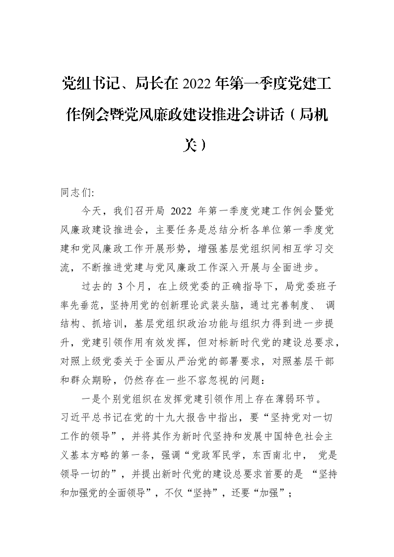 / 党组书记、局长在2022年第一季度党建工作例会暨党风廉政建设推进会讲话(局机关)