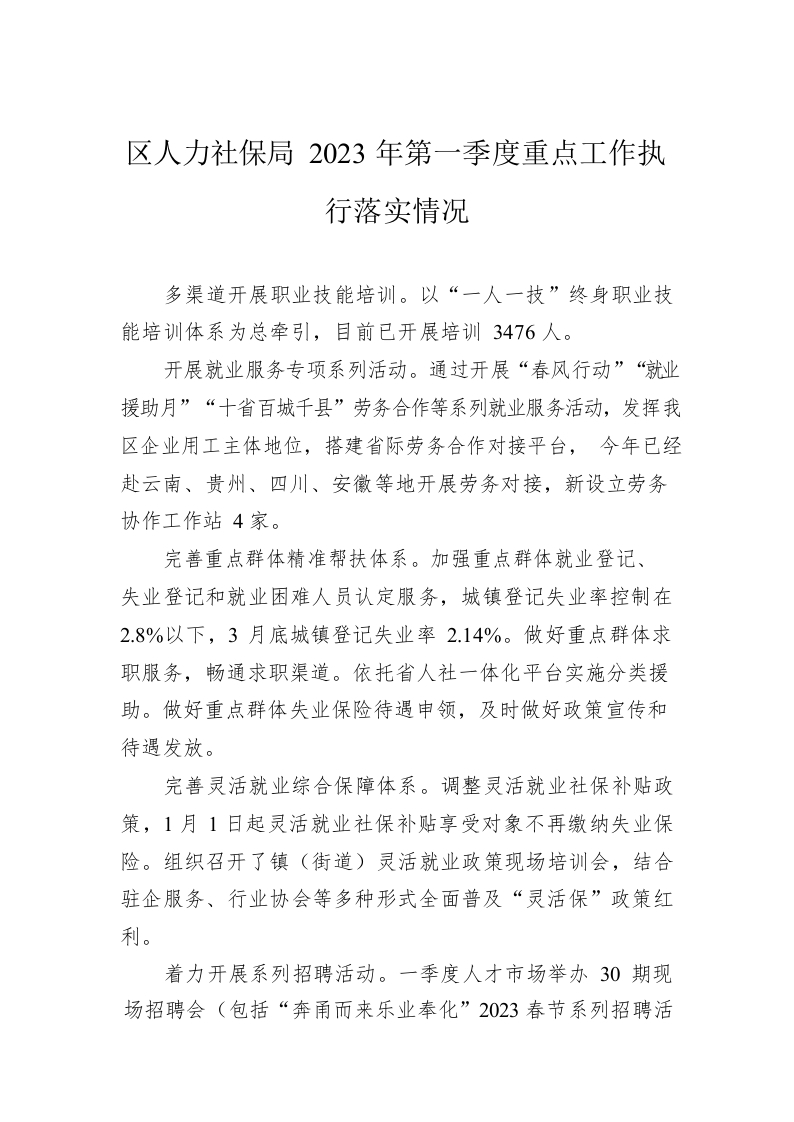 / 区人力社保局2023年第一季度重点工作执行落实情况(20230426)