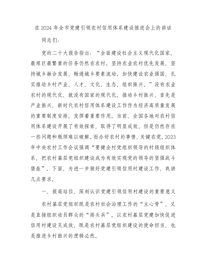 / 在2024年全市党建引领农村信用体系建设推进会上的讲话