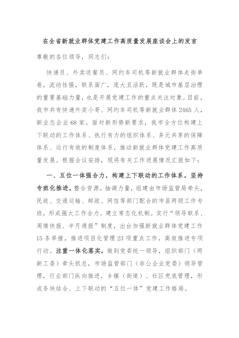 / 在全省新就业群体党建工作高质量发展座谈会上的发言稿