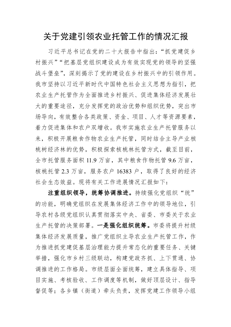 / 关于党建引领农业托管工作的情况汇报