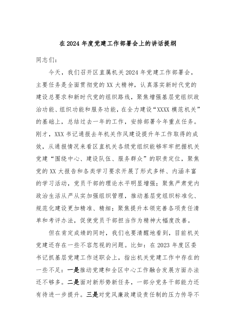 / 在2024年度党建工作部署会上的讲话稿提纲