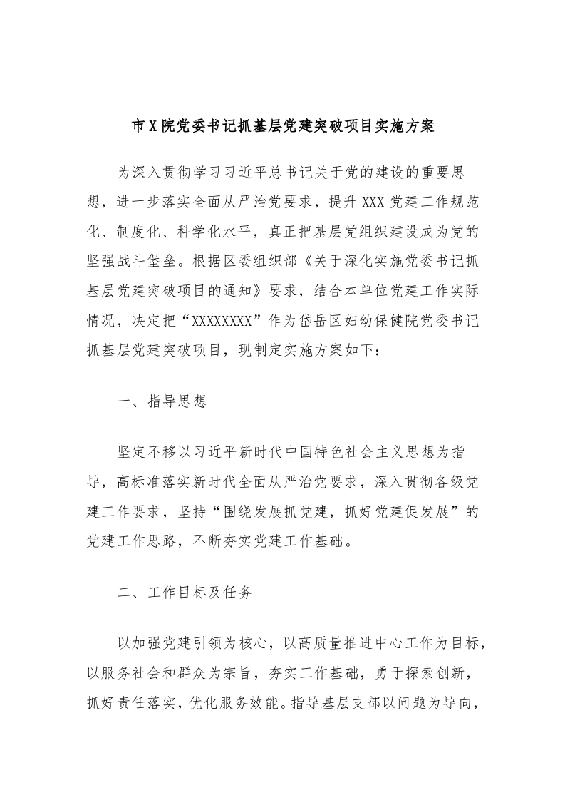/ 市X院党委书记抓基层党建突破项目实施方案