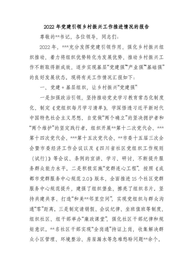 / 2022年党建引领乡村振兴工作推进情况的报告
