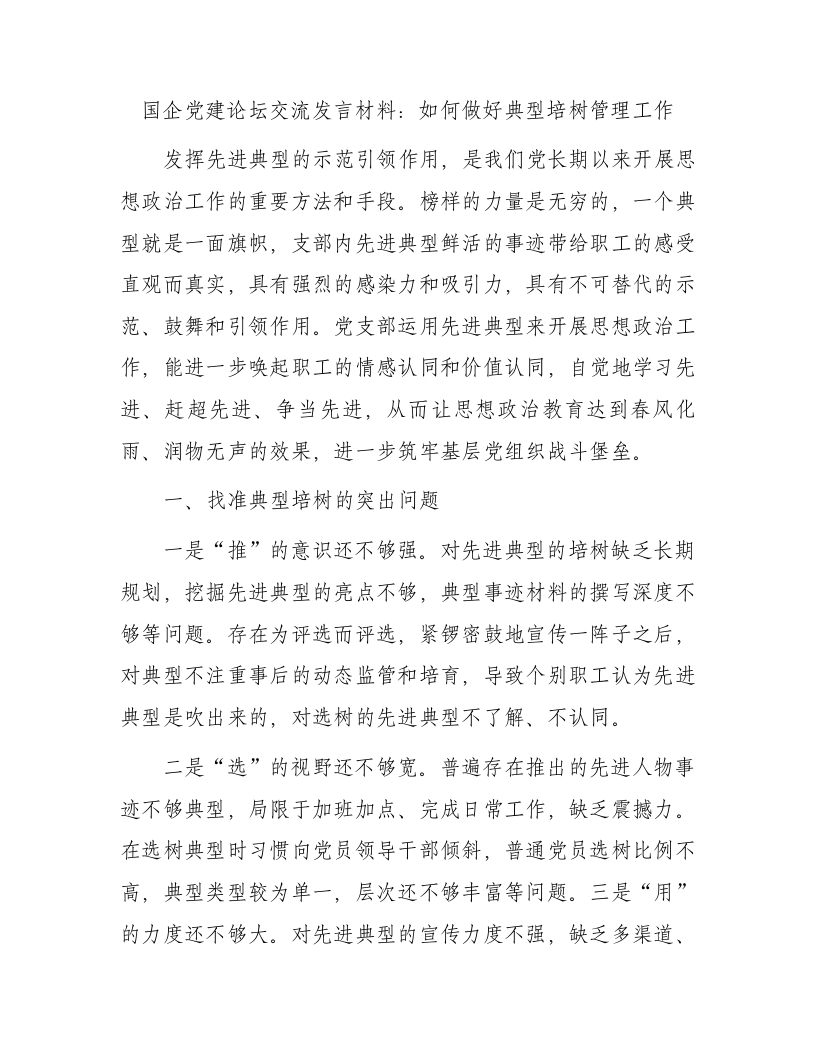 / 国企党建论坛交流发言:如何做好典型培树管理工作
