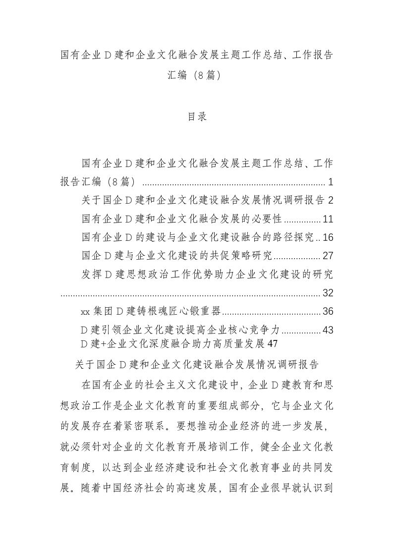 / 国有企业党建和企业文化融合发展主题工作总结、工作报告汇编(8篇)