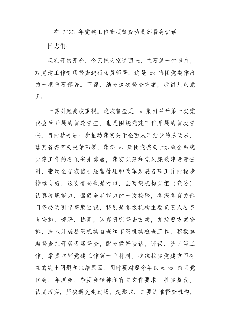 在2023年党建工作专项督查动员部署会讲话(公司)