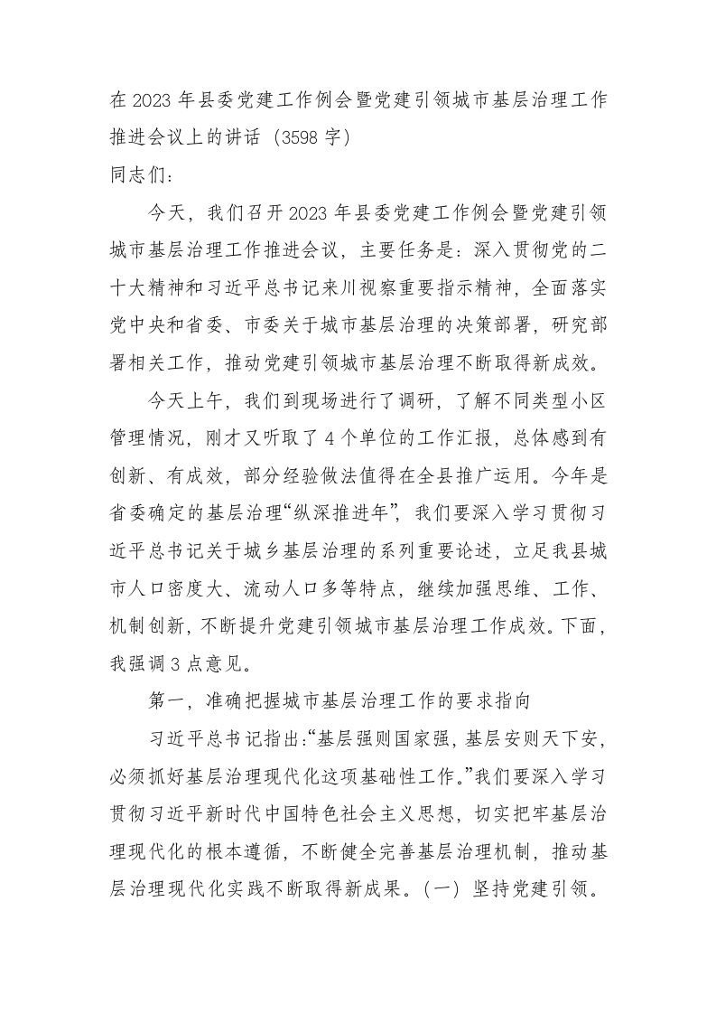 / 在2023年县委党建工作例会暨党建引领城市基层治理工作推进会议上的讲