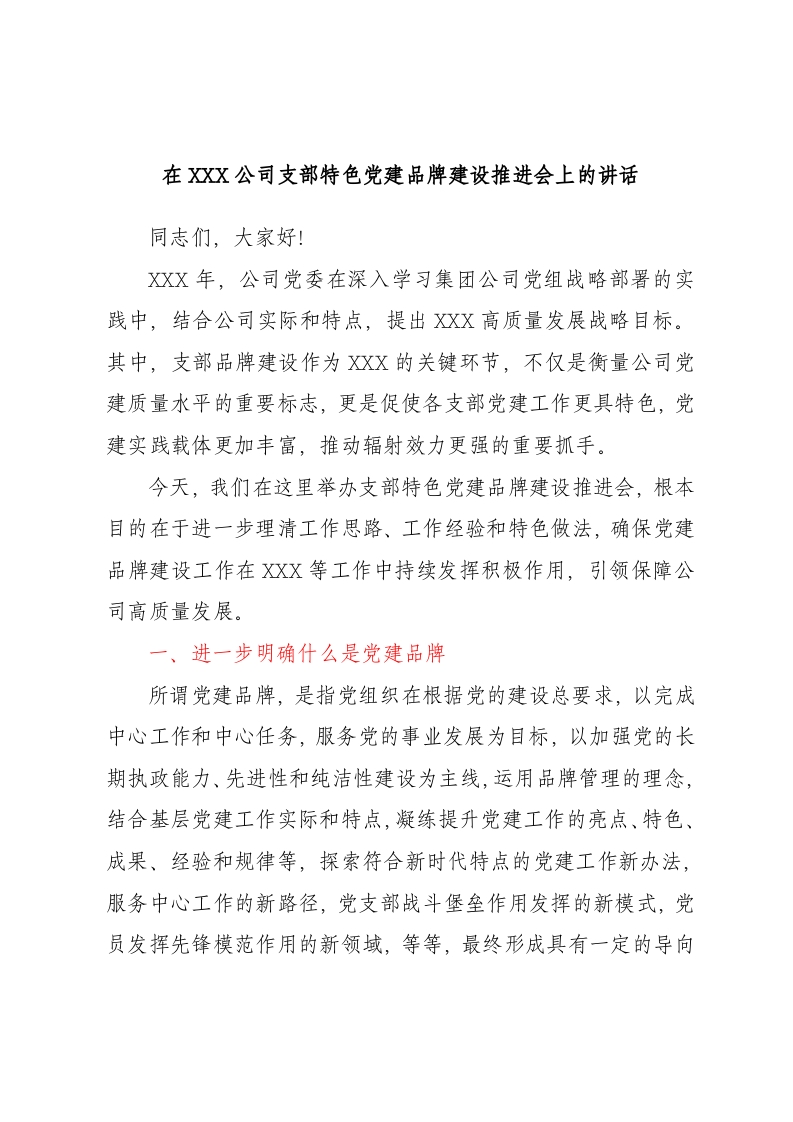 / 在XXX公司支部特色党建品牌建设推进会上的讲话