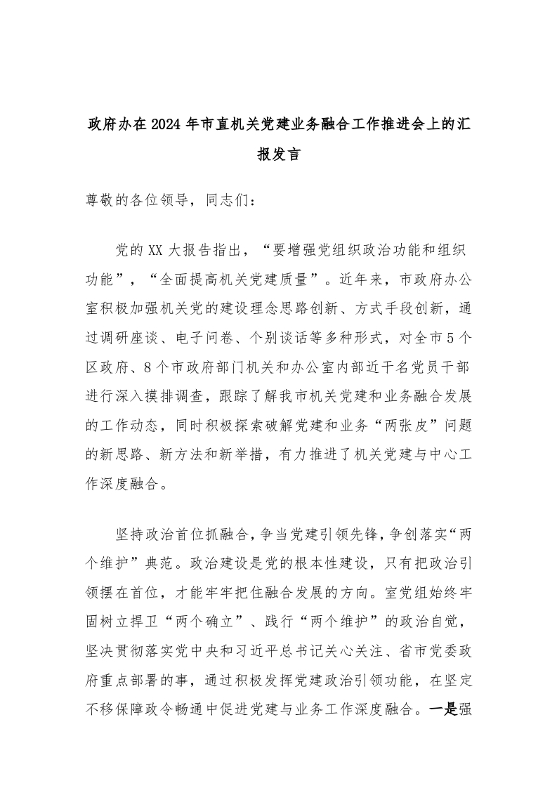/ 政府办在2024年市直机关党建业务融合工作推进会上的汇报发言