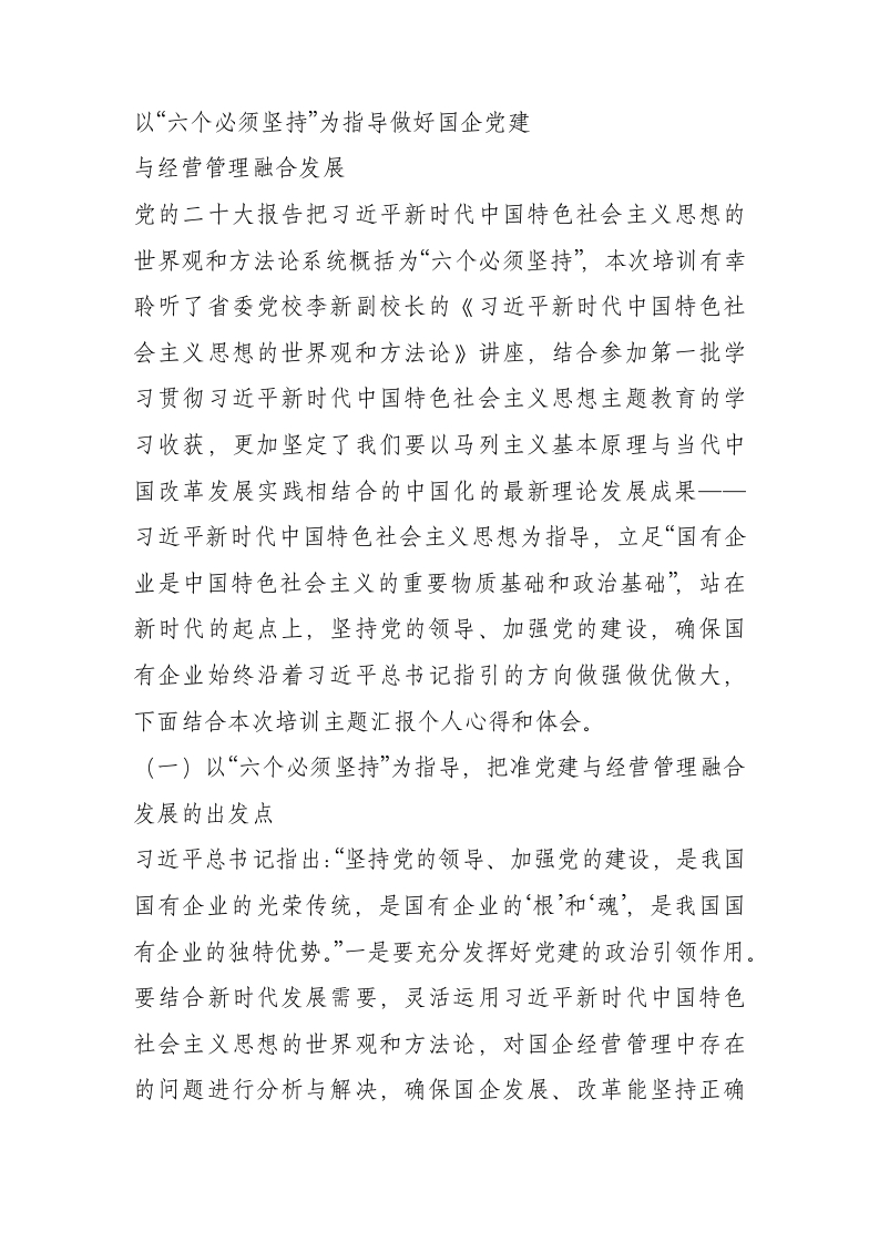 学习心得 : 以“六个必须坚持”为指导做好国企党建与经营管理融合发展