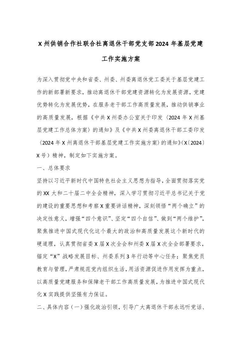 / X州供销合作社联合社离退休干部党支部2024年基层党建工作实施方案