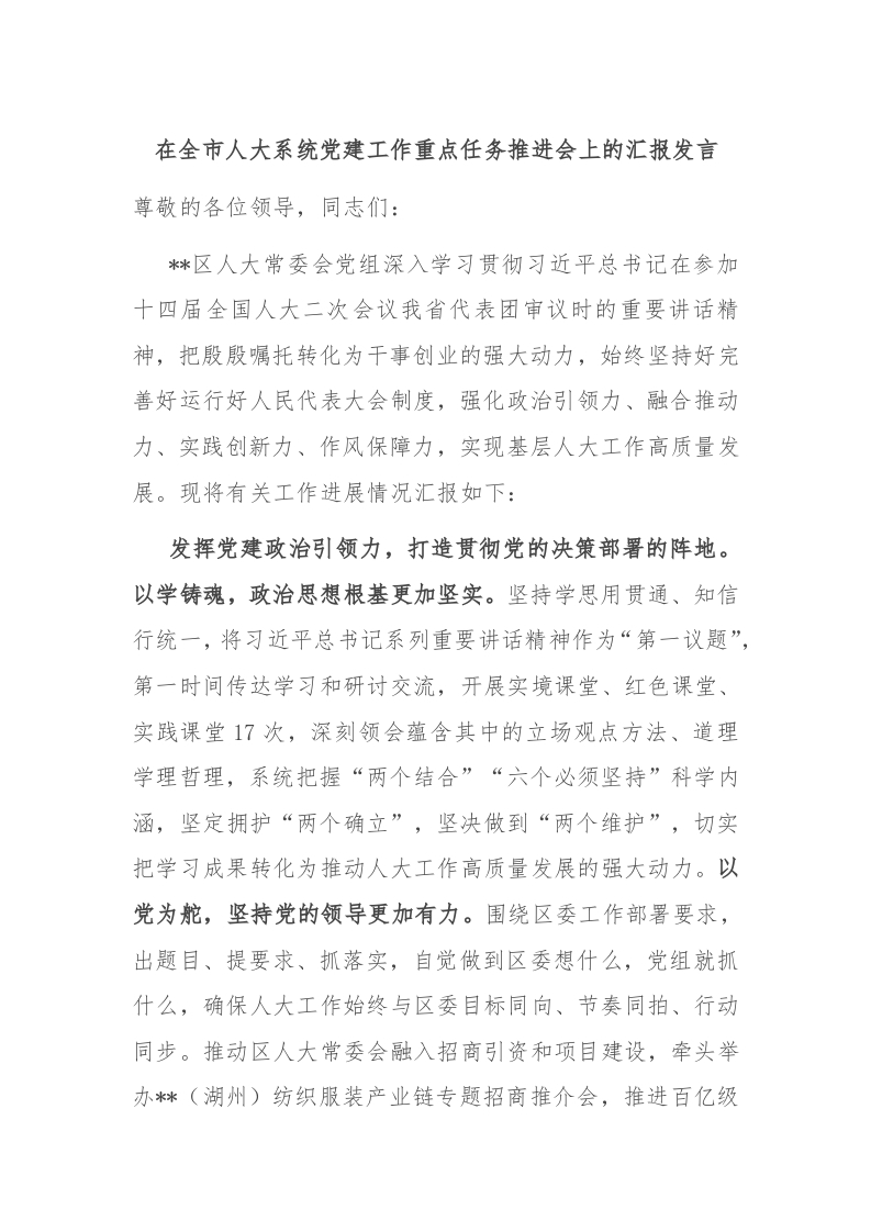 / 在全市人大系统党建工作重点任务推进会上的汇报发言