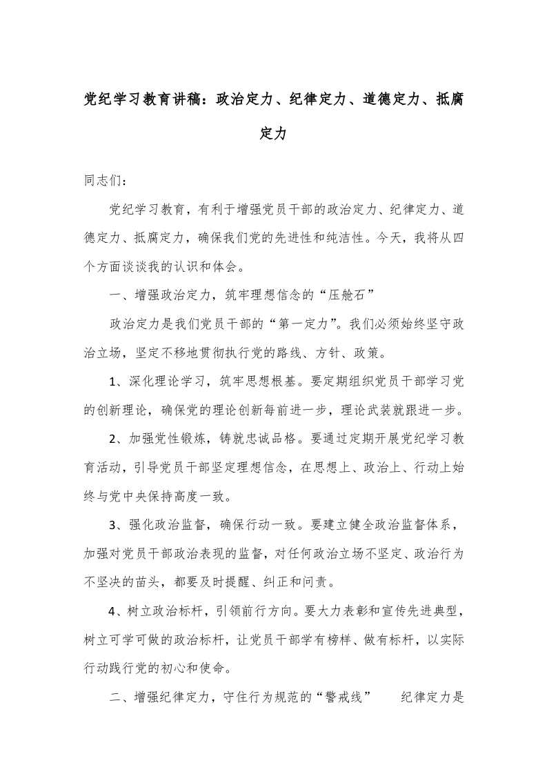 党纪学习教育讲稿:政治定力、纪律定力、道德定力、抵腐定力