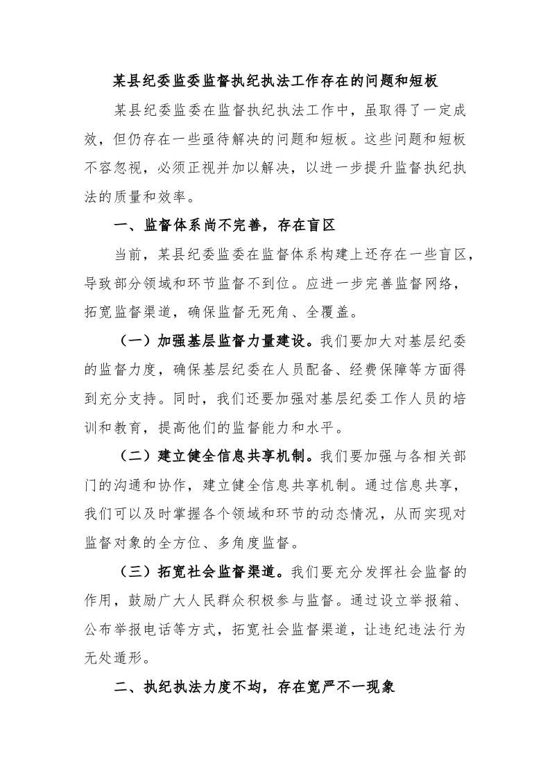 / 某县纪委监委监督执纪执法工作存在的问题和短板