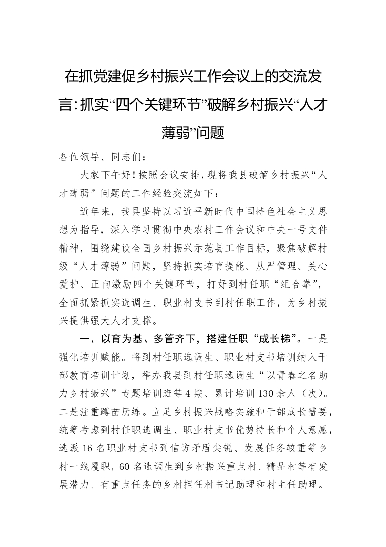/ 在抓党建促乡村振兴工作会议上的交流发言:抓实“四个关键环节”+破解乡村振兴“人才薄弱”问题