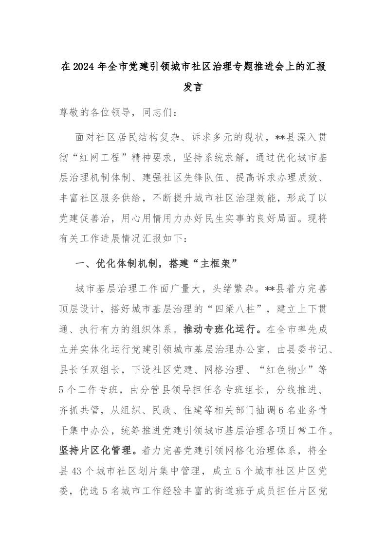 / 在2024年全市党建引领城市社区治理专题推进会上的汇报发言