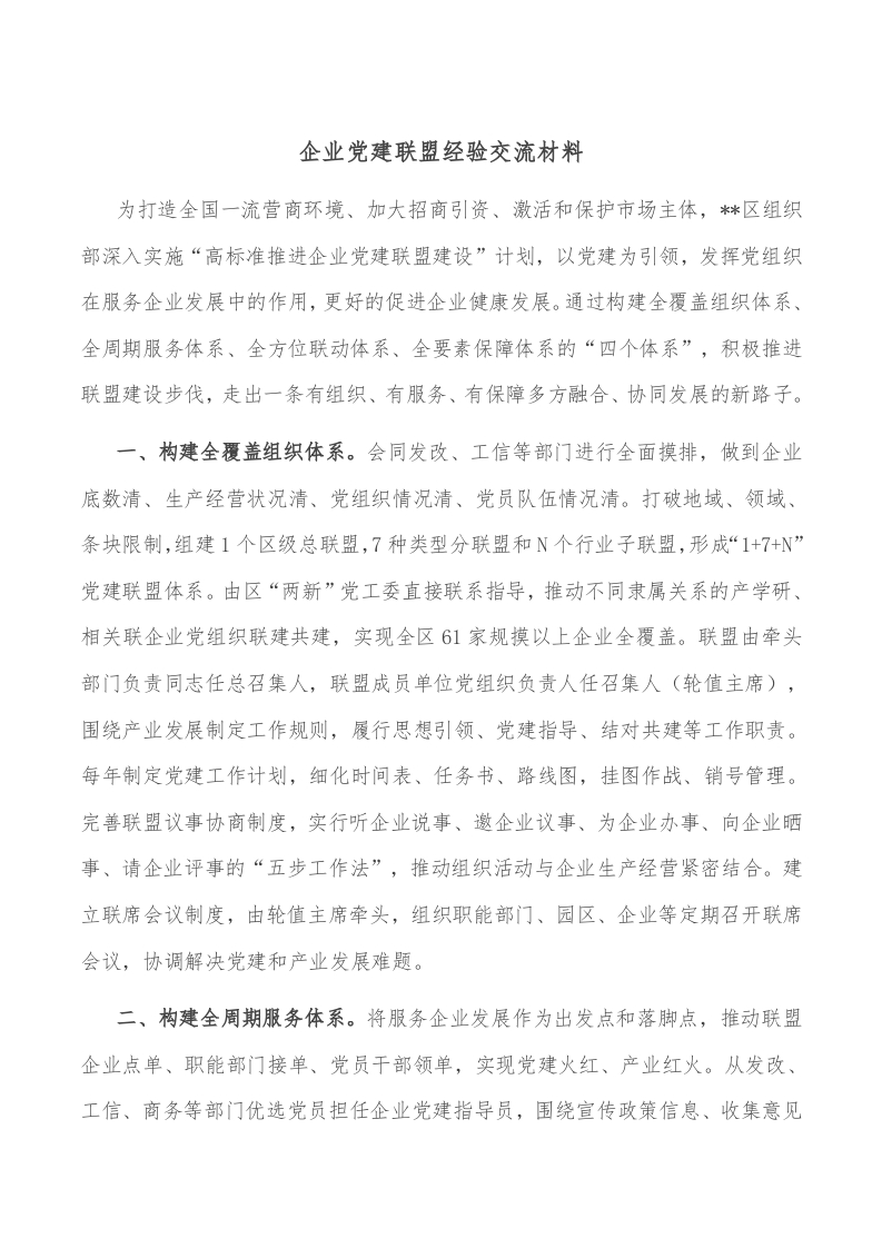 / 企业党建联盟经验交流材料