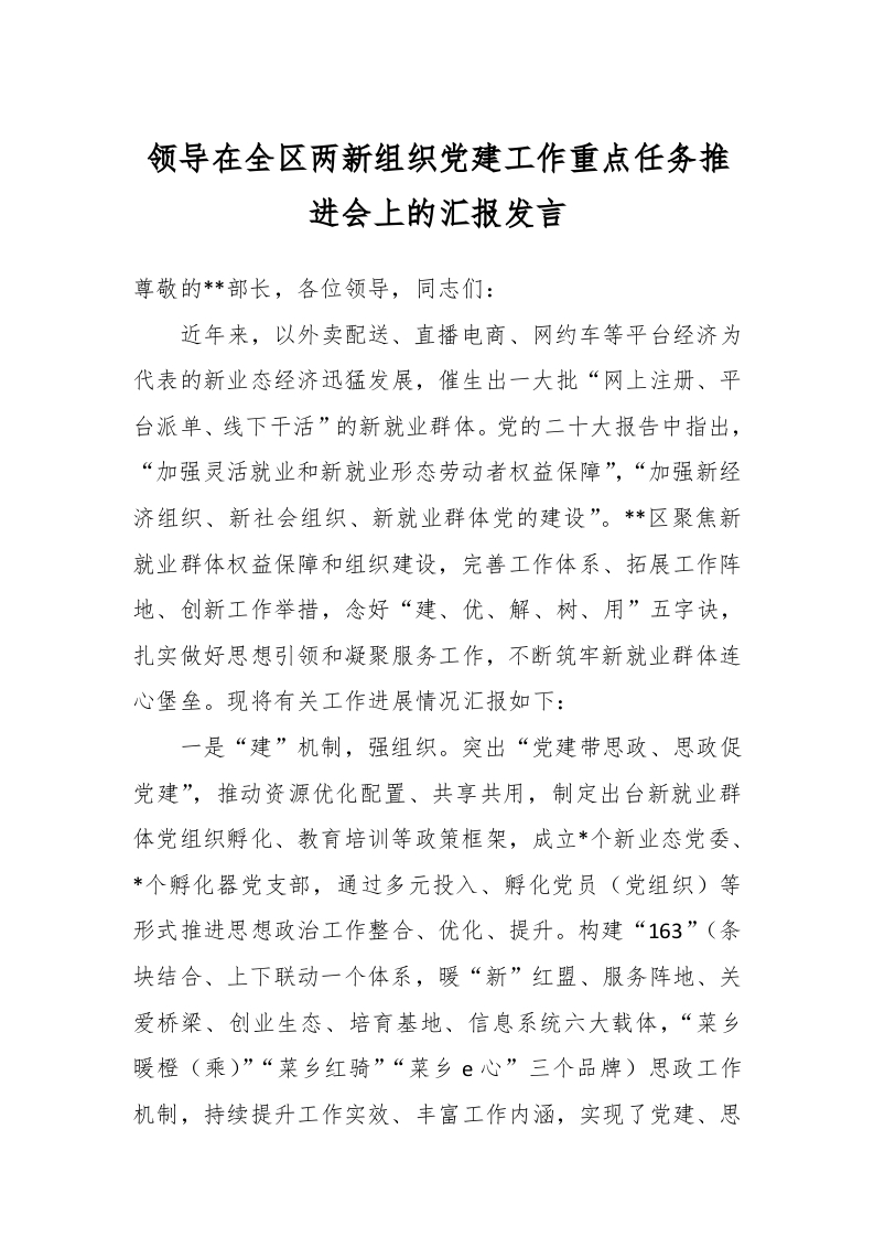 / 领导在全区两新组织党建工作重点任务推进会上的汇报发言
