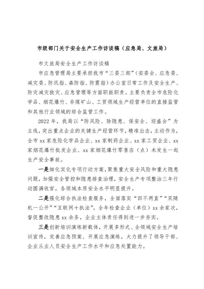 / 市级部门关于安全生产工作访谈稿(应急局、文旅局)